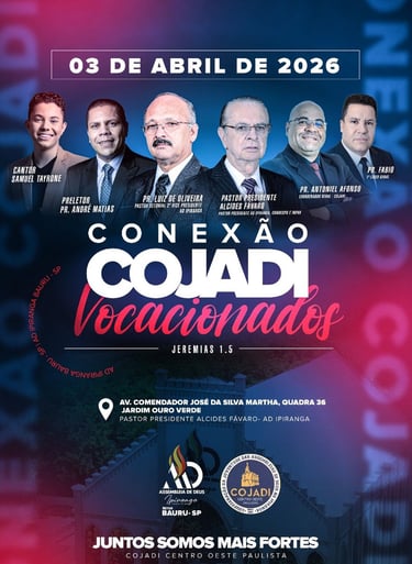 O Conexão COJADI 2026 será um grande encontro que reunirá jovens das Assembleias de Deus – Ministério Ipiranga de todo o Centro-Oeste Paulista, fortalecendo a comunhão, a identidade e o propósito de uma geração vocacionada.